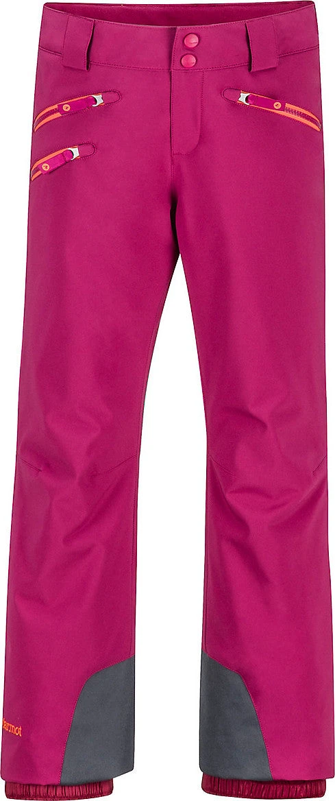 When the weather calls for deep powder on the mountain, give her the gear to carve her own path with the Girls’ Slopestar Snow Pants. Waterproof/breathable Marmot MemBrain® fabric repels heavy rain and snow for hours, while the 100% taped seams also help keep water out. Moisture-wicking and breathable 60 gram Thermal R insulation keeps her warm and dry while still staying compressible. Articulated knees, and Cordura® scuff guards mean a more comfortable trip up and down the mountain. The unique, adjustable-length cuffs grows with her, so she’ll be able to shred in these pants season after season.